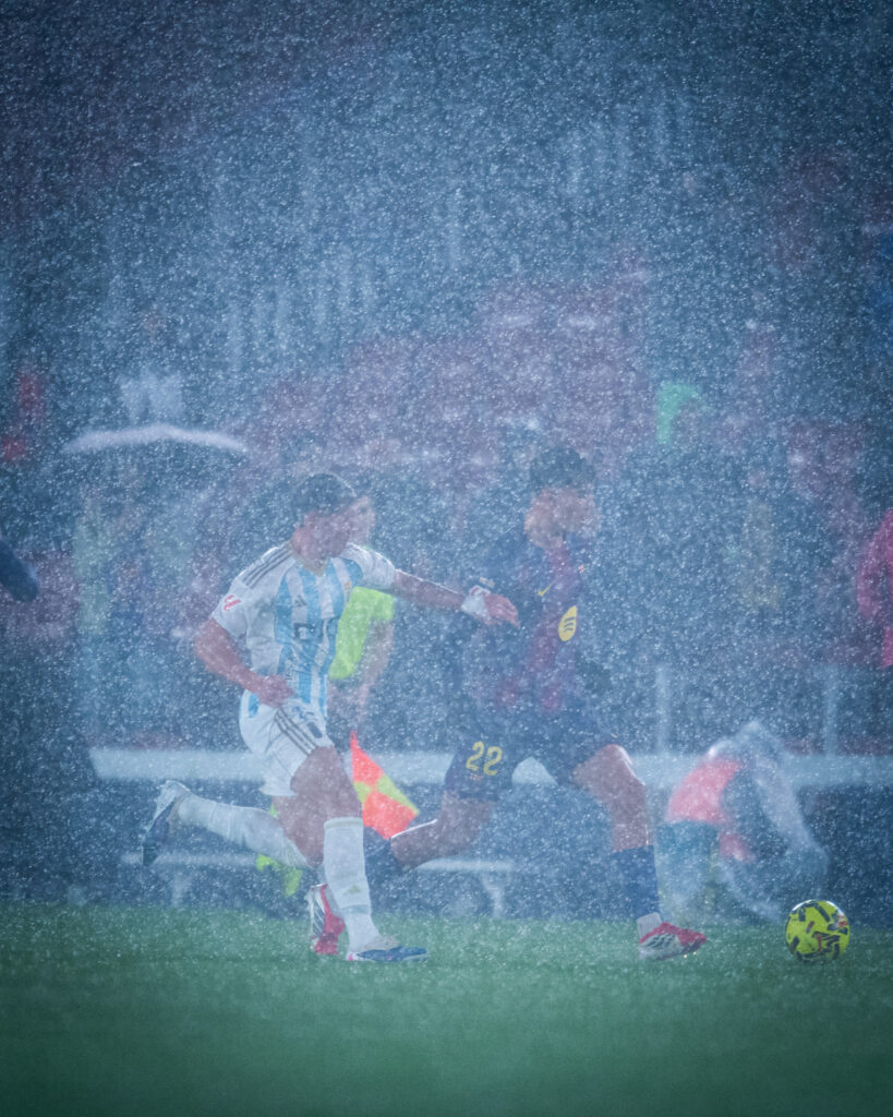 De la siesta en una tarde desapacible ante el colista a la lluvia de goles y el literal aguacero con granizo incluido. Al sexto partido en el nuevo Spotify Camp Nou, aún sin visera en la Tribuna, llegó lo que no suele en Barcelona. Se desató la tormenta y de qué manera aunque ya con los deberes hechos para el Barça de Hansi Flick mientras algunos paraguas se abrían en el palco entre los directivos del Oviedo empezando por su presidente, Martín Peláez. Aguantó Joan Laporta en primera fila junto al vicepresidente primero azulgrana, Rafa Yuste, y Berni Álvarez, Conseller d’Esports de la Generalitat, en el estreno de un partido con aguacero.